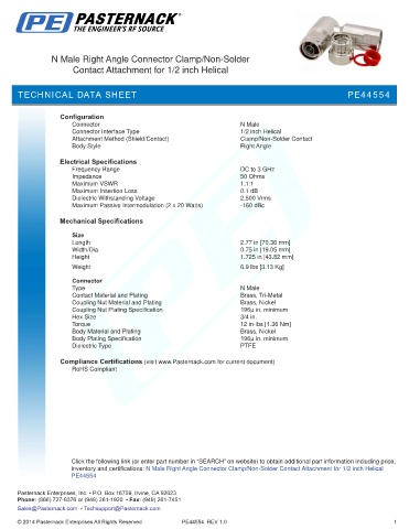 inventory and certifications: N Male Right Angle Connector Clamp/Non-Solder Contact Attachment for 1/2 inch Helical
