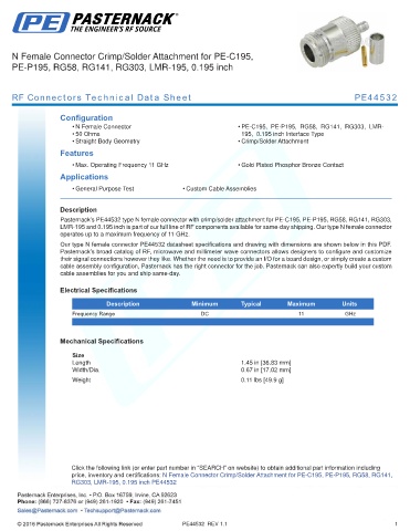 price, inventory and certifications: N Female Connector Crimp/Solder Attachment for PE-C195, PE-P195, RG58, RG141,