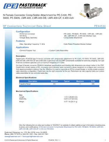 Pasternack’s PE44534 type N female connector with crimp/solder attachment for PE-C400, PE-B400, PE-B405, LMR-400,