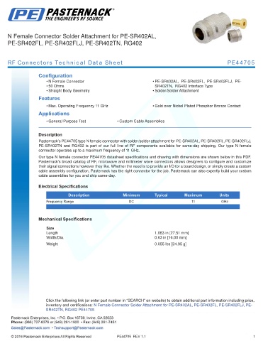 inventory and certifications: N Female Connector Solder Attachment for PE-SR402AL, PE-SR402FL, PE-SR402FLJ, PE-