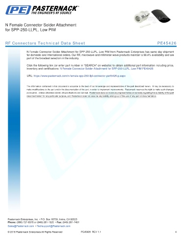 inventory and certifications: N Female Connector Solder Attachment for SPP-250-LLPL, Low PIM PE45426