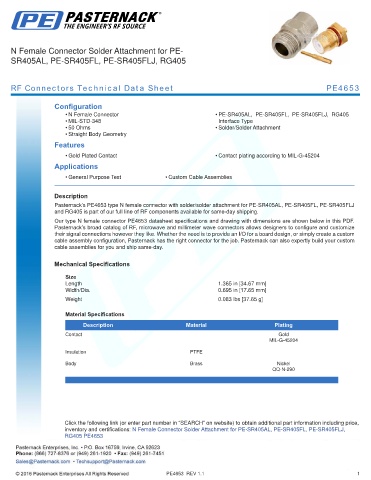 Pasternack’s PE4653 type N female connector with solder/solder attachment for PE-SR405AL, PE-SR405FL, PE-SR405FLJ