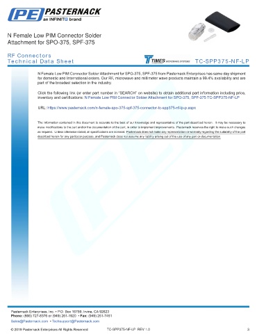 any representation or warranty regarding the suitability of the part described herein for any particular purpose, and Pasternack does not assume any liability arising out of the use of any part or documentation.