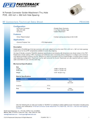 Our type N female connector PE44396 datasheet specifications and drawing with dimensions are shown below in this PDF.