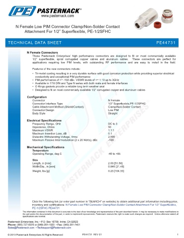 inventory and certifications: N Female Low PIM Connector Clamp/Non-Solder Contact Attachment For 1/2” Superflexible,