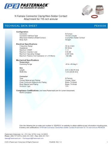 inventory and certifications: N Female Connector Clamp/Non-Solder Contact Attachment for 7/8 inch annular PE45036