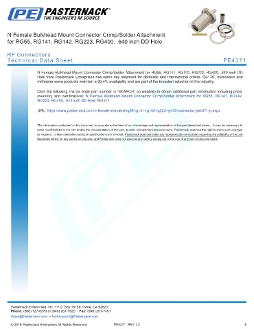 any representation or warranty regarding the suitability of the part described herein for any particular purpose, and Pasternack does not assume any liability arising out of the use of any part or documentation.