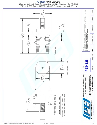 PE44528 CAD Drawing N Female Bulkhead Mount Connector Crimp/Solder Attachment for PE-C195, PE-P195, RG58, RG141, RG303, LMR-195, 0.195 inch, .640 inch DD Hole PE44528 REV 1.1 3