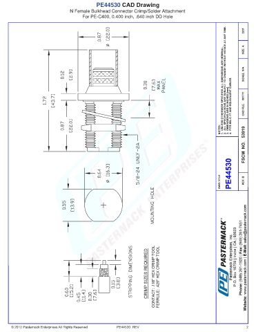 PE44530 CAD Drawing N Female Bulkhead Connector Crimp/Solder Attachment For PE-C400, 0.400 inch, .640 inch DD Hole © 2012 Pasternack Enterprises All Rights Reserved PE44530 REV 2