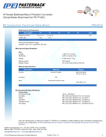 inventory and certifications: N Female Bulkhead Mount Precision Connector Clamp/Solder Attachment for PE-P142LL