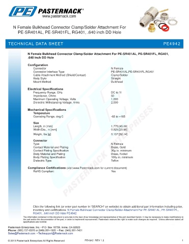 inventory and certifications: N Female Bulkhead Connector Clamp/Solder Attachment For PE-SR401AL, PE-SR401FL,