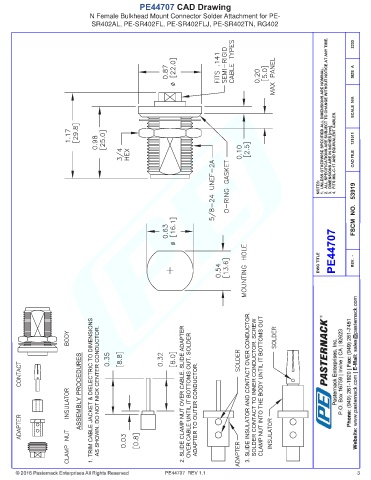 PE44707 CAD Drawing N Female Bulkhead Mount Connector Solder Attachment for PE- SR402AL, PE-SR402FL, PE-SR402FLJ, PE-SR402TN, RG402 PE44707 REV 1.1 3