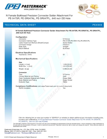 inventory and certifications: N Female Bulkhead Precision Connector Solder Attachment For PE-047SR, PE-SR047AL,