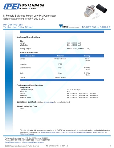 inventory and certifications: N Female Bulkhead Mount Low PIM Connector Solder Attachment for SPP-250-LLPL TC- -