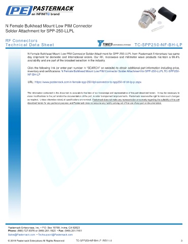 any representation or warranty regarding the suitability of the part described herein for any particular purpose, and Pasternack does not assume any liability arising out of the use of any part or documentation.