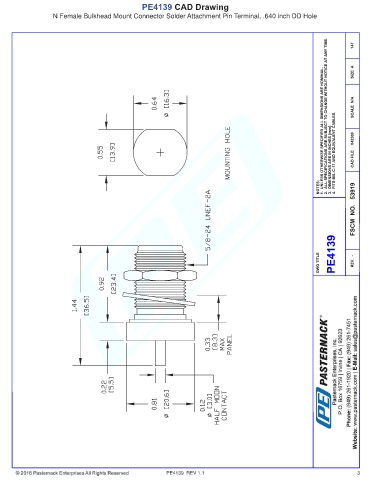 PE4139 CAD Drawing N Female Bulkhead Mount Connector Solder Attachment Pin Terminal, .640 inch DD Hole PE4139 REV 1.1 3