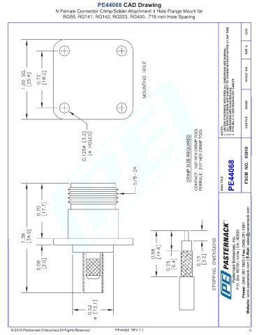 PE44068 CAD Drawing N Female Connector Crimp/Solder Attachment 4 Hole Flange Mount for RG55, RG141, RG142, RG223, RG400, .718 inch Hole Spacing PE44068 REV 1.1 3