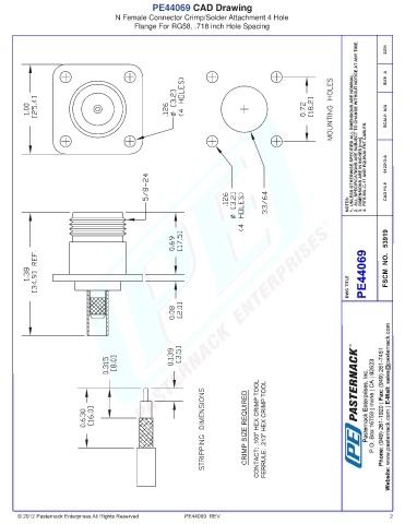 PE44069 CAD Drawing N Female Connector Crimp/Solder Attachment 4 Hole Flange For RG58, .718 inch Hole Spacing © 2012 Pasternack Enterprises All Rights Reserved PE44069 REV 2