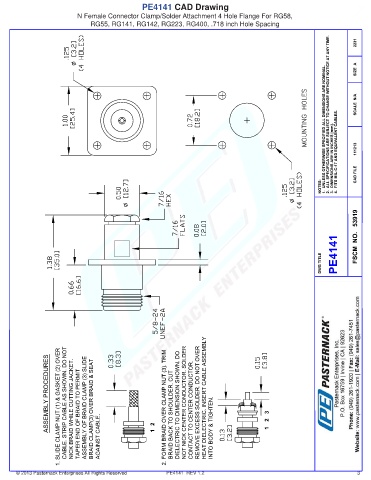 PE4141 CAD Drawing N Female Connector Clamp/Solder Attachment 4 Hole Flange For RG58, RG55, RG141, RG142, RG223, RG400, .718 inch Hole Spacing © 2013 Pasternack Enterprises All Rights Reserved PE4141 REV 1.2 3