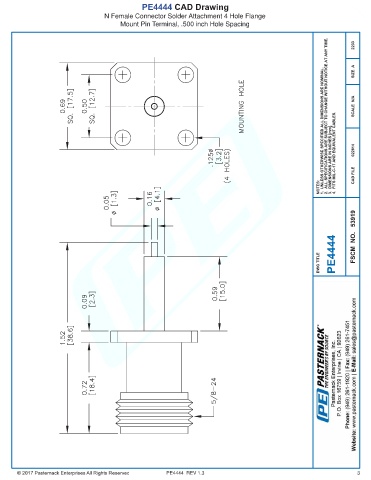 PE4444 CAD Drawing N Female Connector Solder Attachment 4 Hole Flange Mount Pin Terminal, .500 inch Hole Spacing PE4444 REV 1.3 3