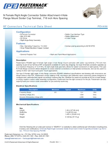 Our type N female right angle 4 hole flange connector PE4486 datasheet specifications and drawing with dimensions are
