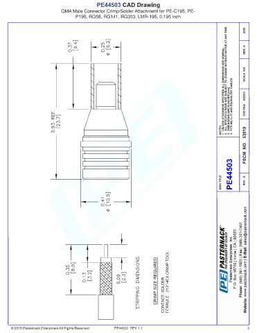 PE44503 CAD Drawing QMA Male Connector Crimp/Solder Attachment for PE-C195, PE- P195, RG58, RG141, RG303, LMR-195, 0.195 inch PE44503 REV 1.1 3