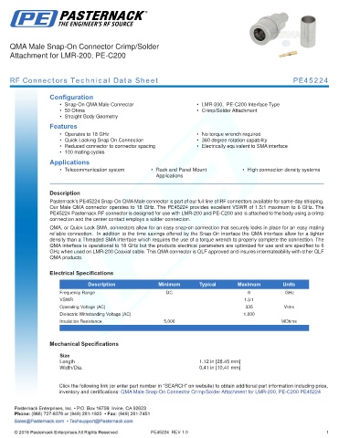 PE45224 Pasternack RF connector is designed for use with LMR-200 and PE-C200 and is attached to the body using a crimp