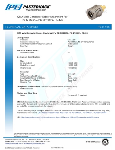 inventory and certifications: QMA Male Connector Solder Attachment For PE-SR405AL, PE-SR405FL, RG405 PE44495