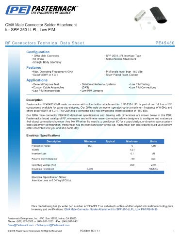 Pasternack’s PE45430 QMA male connector with solder/solder attachment for SPP-250-LLPL is part of our full line of RF