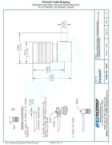 PE44497 CAD Drawing QMA Male Right Angle Connector Solder Attachment For PE-SR405AL, PE-SR405FL, RG405 © 2014 Pasternack Enterprises All Rights Reserved PE44497 REV 1.1 3
