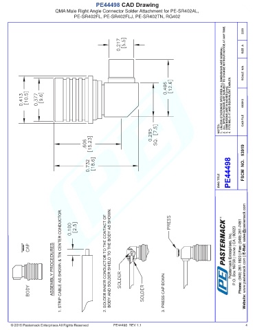 PE44498 CAD Drawing QMA Male Right Angle Connector Solder Attachment for PE-SR402AL, PE-SR402FL, PE-SR402FLJ, PE-SR402TN, RG402 PE44498 REV 1.1 4
