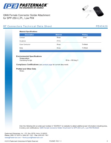 inventory and certifications: QMA Female Connector Solder Attachment for SPP-250-LLPL, Low PIM PE45429 -