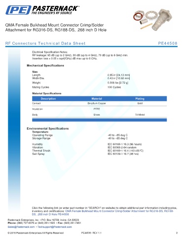 inventory and certifications: QMA Female Bulkhead Mount Connector Crimp/Solder Attachment for RG316-DS, RG188-