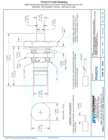 PE45218 CAD Drawing QMA Female Bulkhead Mount Connector Solder Attachment for PE- SR405AL, PE-SR405FL, RG405, .268 inch D Hole PE45218 REV .1 3